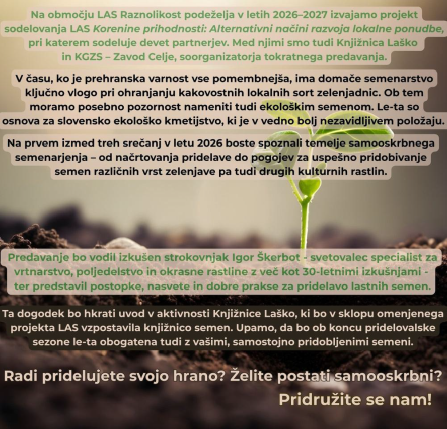 Obveščamo vas, da bo danes, 9. 4. 2026 potekalo prvo predavanje o semenarjenju, ki ga bo izvedel Igor Škerbot iz KGZS – Zavod Celje.
